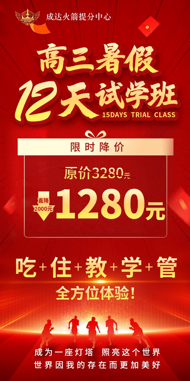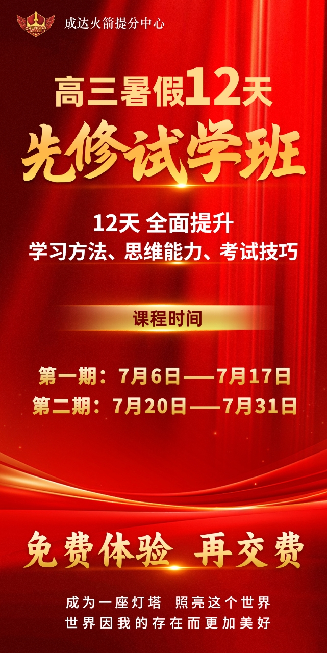 即将升入高三的同学们,想实现成绩的提升吗?暑期弯道超车的绝佳机会来啦!成达火箭提分中心高三暑假 12 天试学班震撼来袭!